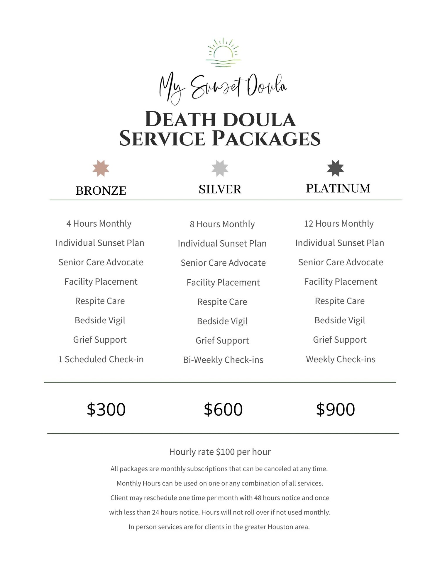 Sunset Planning is Senior Care and End of Life Planning. Discover compassionate guidance for aging and dying. Prepare for senior care and living systems. Use our death doula services, grief support and comprehensive end of life planning with My Sunset Doula. Our services include end of life planning, bedside vigils, respite care, grief and caregiver support. Get peace of mind with expert support for peaceful life transitions.